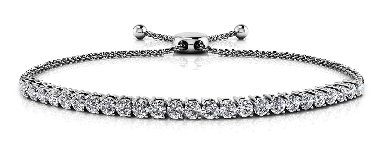 This classic 2-Prong round diamond adjustable slider bracelet is designed using a minimum amount of metal in order to showcase the brilliance of each diamond. It can be purchased in Platinum or Gold and in a variety of diamond total weights.