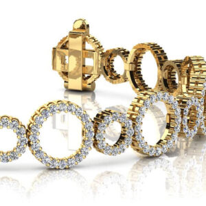 Design your own beautiful look with this modern gold tennis bracelet. Featuring larger diamond circles alternating with smaller diamond circle links, this expertly crafted bracelet can be made in either gold or platinum. It’s available in 3 different sizes of your choice beginning with the 4.16 carats total diamond weight, which features 297 diamonds, the 5.22 carats total diamond weight which has 261 amazing diamonds or a whopping 6 carats total diamond weight – featuring 240 diamonds.