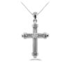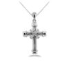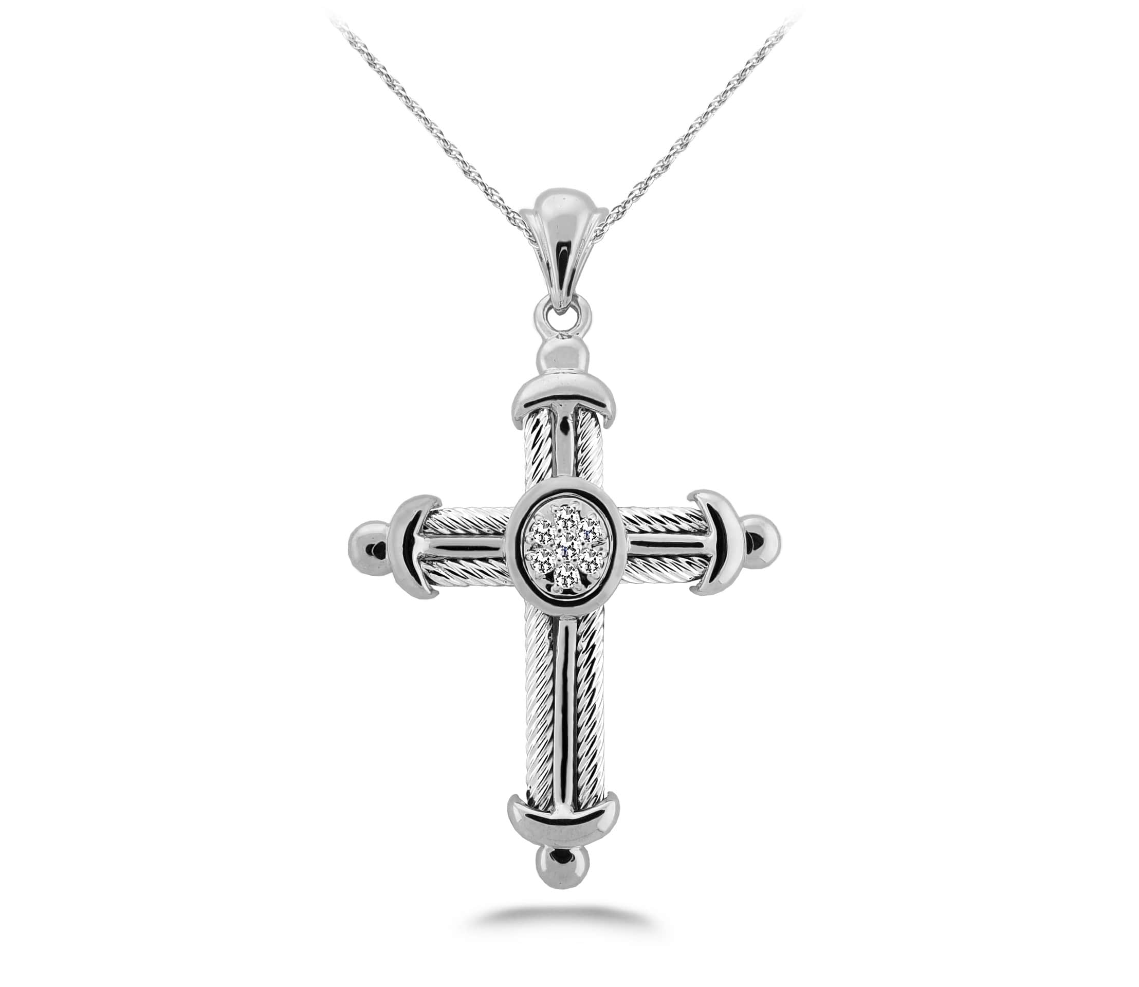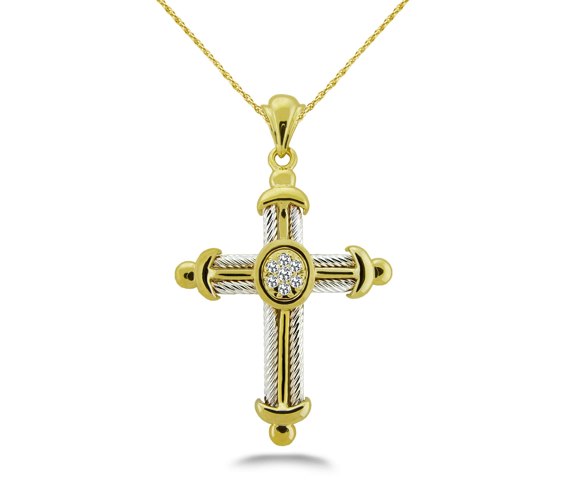 A designer’s touch on a classic piece . this is a lovely cross pendant that lets you wear your devotion close to your heart. The center cluster features 7 incredible diamonds which are available in two different sizes in this two-tone masterpiece. The 1.25mm size features .09 total diamond weight, or you can also choose the 2mm size, which features a total diamond weight of ¼ carat . either would be a brilliant choice.
