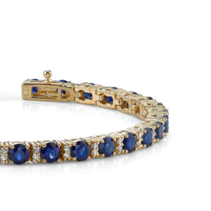 A lovely combination of deep sapphires and sparkly diamonds make this bracelet design one of a kind! Best of all, you can change the gemstone selection if you’d like. Each of the round gemstones is set with a secure four prong design keeping them in place as you wear this one regularly or save it for special occasions! Available in two sizes, either a 5.02 ct. or a 8.37 ct. and in your choice of yellow gold, white gold and platinum. Order this as a gift for someone or for yourself, and it will be treasured for many years to come!