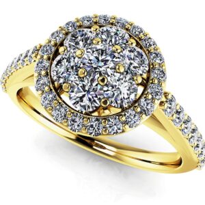 This beautiful ring blossoms just like your love! Brilliant round diamonds form into a charming flower cluster shape, surrounded by a halo of even more diamonds that continue along the band. Give her a flower that will bloom for life with this elegant ring. Available in your choice of gold or platinum setting.