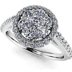 This beautiful ring blossoms just like your love! Brilliant round diamonds form into a charming flower cluster shape, surrounded by a halo of even more diamonds that continue along the band. Give her a flower that will bloom for life with this elegant ring. Available in your choice of gold or platinum setting.