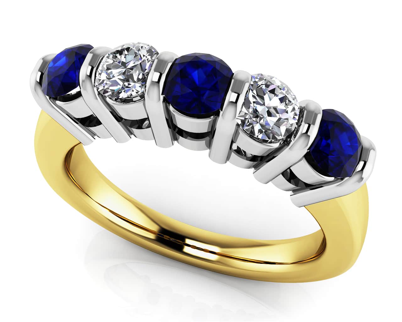 This is a wonderful choice if you want to combine colorful gemstones with bright diamonds. Each lovely stone, either 5 or 7 depending on which carat size you choose, is carefully set between lovely .borders.. Choose from a gold or platinum setting and choice of gemstones. The metal separators are striking, and will truly show off each stone to its fullest potential! This alternating gemstone and diamond ring will have 3 gemstones and 2 diamonds in the 5 stone versions and 4 gemstones and 3 diamonds in the 7 stone versions. It.s available in three different sizes including .53, .70 and 1.25 carats. Customize this one today!