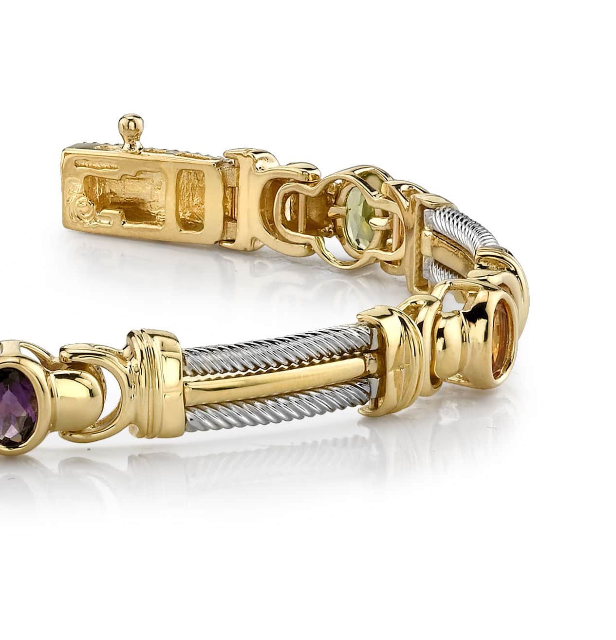 Very unique – and very lovely! That’s the way to describe this bracelet. There’s a lot of design here, and you won’t be disappointed! It features beautiful cabling on either side of a solid metal tube. Each section is linked with a fabulous oval gemstone. Have this made in your choice of gold or platinum, the two-toned effect is incredible. Anyone who sees it will want one!