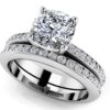 This simple and stunning bridal set is a brilliant selection. With a sleek shank and four prongs, this setting is striking. In the center of the setting is a gorgeous cushion cut diamond. Customize the bridal set by selecting the metal type, total carat weight, diamond quality and ring size.