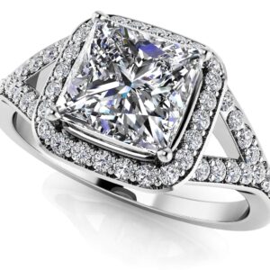 Captivating diamond engagement ring featuring a princess cut center stone set with four prongs. The center stone is surrounded by smaller diamonds, further enhancing the beauty of the princess cut diamond. The ring features more round diamonds set along the split ring shank half way down the band. Available in six sizes from 0.75 ct. to 2.25ct. total carat weight. With this ring she is sure to answer the question with a yes!