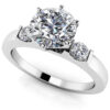 Two lovely diamonds sit perfectly on either side of this unique ring. The band features a groove that adds that little extra flair to this piece! In the center, sits a lovely diamond, in a size you get to choose. We have 4 combinations for you, and no matter which one you choose, we’ll set it in a lovely four-prong setting. You can also decide if you’d like our master craftsmen to make this for you in white or yellow gold, or even platinum. So . get into the groove with this one today!