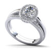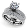 This beautiful diamond bridal set features an engagement ring with a cushion cut center and a diamond band with round diamonds. The set is available in 4 total carat weights for you to choose from. Customize this ring in gold or platinum.