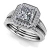 This classic matching bridal set includes a beautiful engagement ring with five choices for the center diamond. The shank of the engagement ring and matching band are lined with round diamonds set with common prongs allowing the maximum amount of sparkle! Available in gold or platinum and five different sizes including 1.46, 1.71, 1.96, 2.21, and 2.46 total diamond weights ensures you have many options for creating the perfect bridal set!