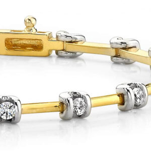 Set in two-tone yellow gold, white gold, or platinum, each sparkling, round diamond is channel-set, spaced with a solid, shimmering link.