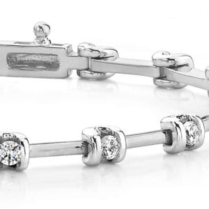 Set in two-tone yellow gold, white gold, or platinum, each sparkling, round diamond is channel-set, spaced with a solid, shimmering link.