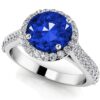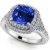 This heavenly ring features a double row of diamonds on the shank that gradually build to the stunning cushion cut gemstone. After one look of this ring, you will be on cloud nine. Customize the ring to your exact taste and budget by selecting the metal type, total carat weight, diamond quality, size and gemstone. All gemstones are AA quality.