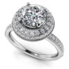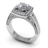 This diamond engagement ring with side stones has a contemporary design and impeccable details. A six prong head holds the center diamond of your choice. Choose from .50, .75, 1.00, 1.25 and 1.50 carats for the prominent center diamond. Along a split ring shank, there are round graduated diamonds in a v-shaped style. Crafted in your favorite metal type, this ring will surely make a statement!