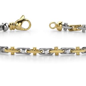Another of our two-tone bracelets, this one features a very unique pattern. The great thing about two-tone pieces like this is that you never have to worry about matching them with existing jewelry collection pieces. You can’t go wrong with this one! It features 14.4 grams of either gold or platinum, and a very sturdy clasp. It will sit flat on the wrist . and look very smart with any ensemble. A brilliant choice!