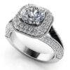 This luxurious diamond wedding ring is full of incredible details that create an intense sparkle. The halo design features not one, but two lovely rows of diamonds surrounding the center stone. The split shank is also lined with sparkling round diamonds along the edges as well some added diamond beauty in the center of the shank. A unique bridge of diamonds under the head gives it a sparkly appeal from the side also. A secure, four prong setting holds the center diamond in place. Choose from various diamond qualities, carat sizes, and metal types to create the ultimate ring of her dreams!