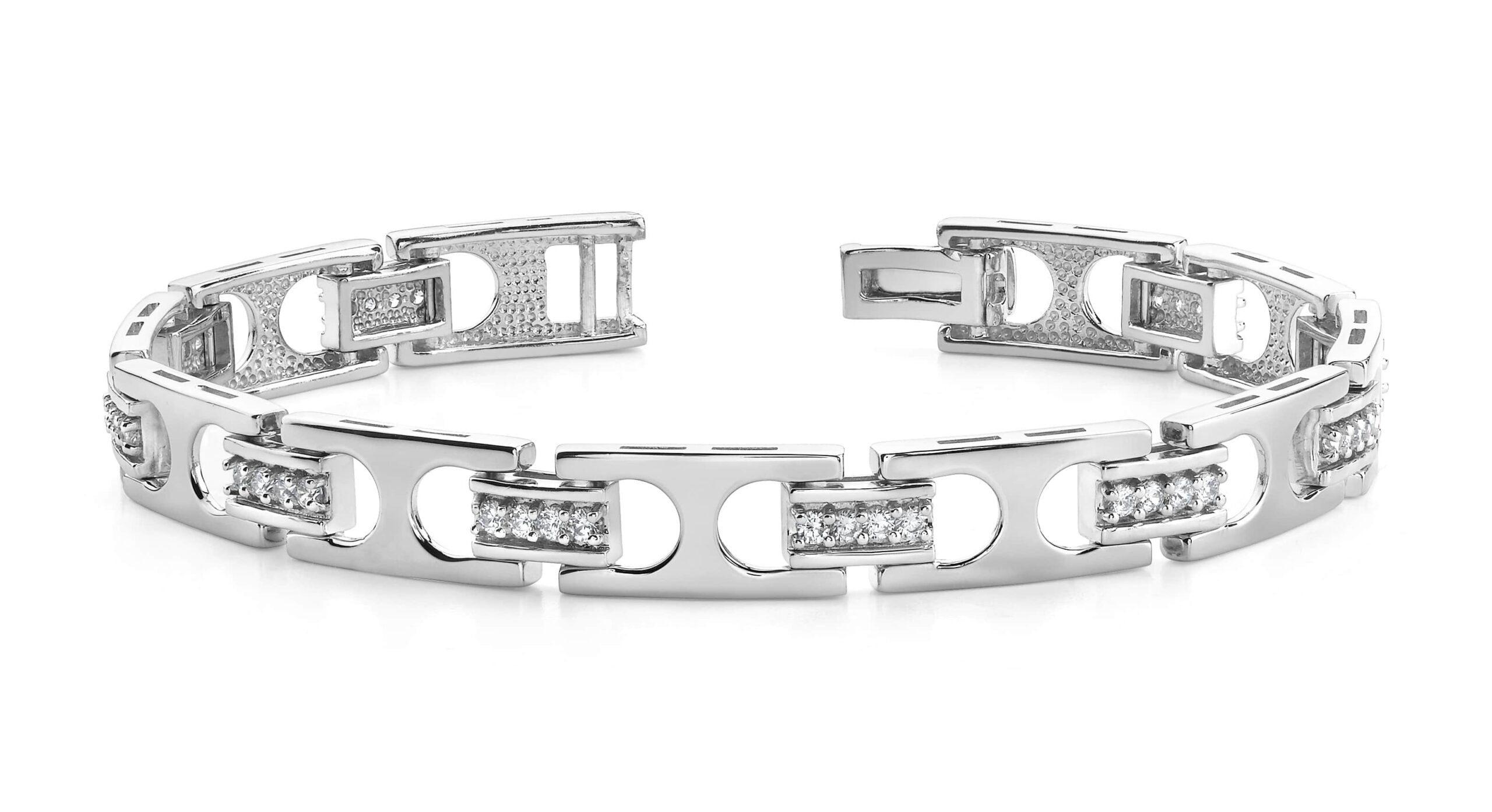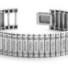 Here’s a real design marvel! This fabulous men’s bracelet is both stylish and masculine! The solid ‘buckle’ links are held together by a contrasting, horizontal link which houses two or four fabulous prong set diamonds. This bracelet features 40 diamonds, with total diamond weights of 1 or 2 carats. We can make any of the 2 available sizes or you in gold or platinum . and you can be sure that anyone who wears it will truly exude class & confidence!
