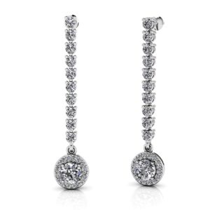 Shine brilliantly with these show-stopping earrings! Sparkling round diamonds drop down to highlight the beautiful halo of icy diamonds with a larger center diamond as the focal point. Measuring approximately 1.7 inches in length, these earrings are the finishing touch to create an unforgettable look.