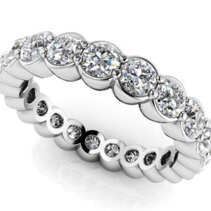 This diamond eternity band has a stunning row of perfectly matched diamonds set in a half bezel with prongs. Whether it is worn as a wedding band or anniversary ring, you’ll certainly make an impression! Customize this ring and make it your own by selecting your choice of metal, total diamond weight, and diamond quality.