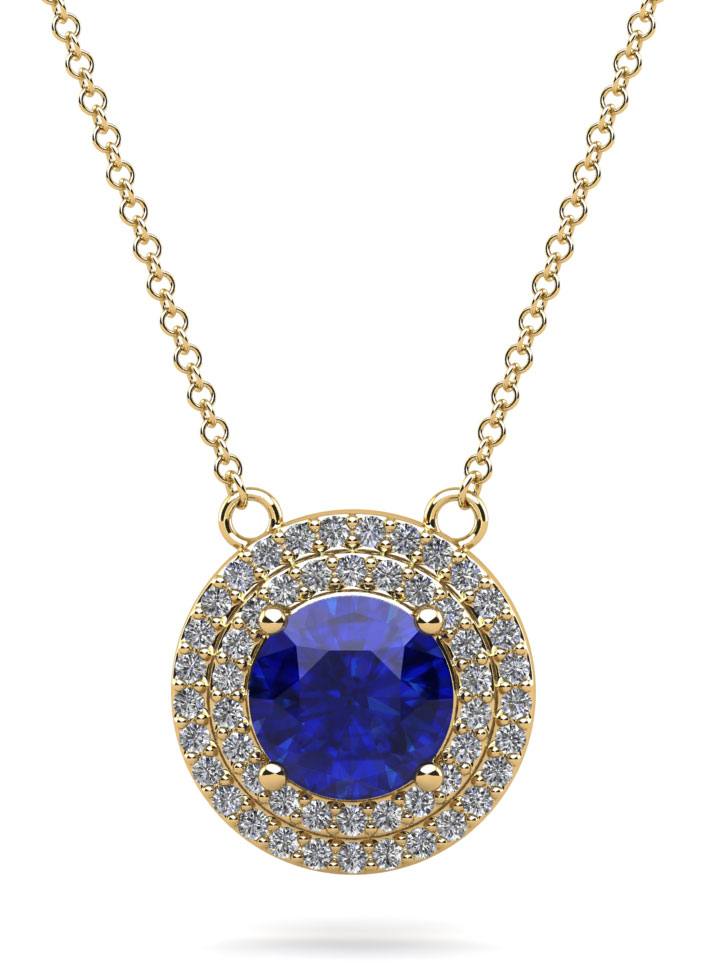 A double halo of diamonds surround a radiant gemstone in this exquisite pendant. Select in your choice of 14k or 18k yellow, rose or white gold or platinum.