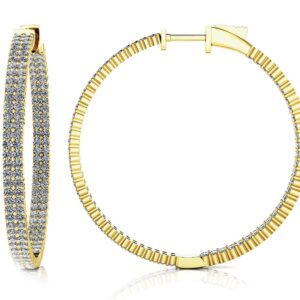 Two rows of lovely diamonds are set on the front and inside of this gorgeous hoop earring design. These large hoop earrings are 1.17 inches high and are the perfect everyday accessory. There are three sizes to choose from including 1.70, 2.18 and 3.34 total diamond weights. A shared prong setting keeps the diamonds secure. Watch as these playful diamond earrings sparkle in your choice of yellow gold, white gold or platinum. These earrings come in a variety of other hoop sizes also.