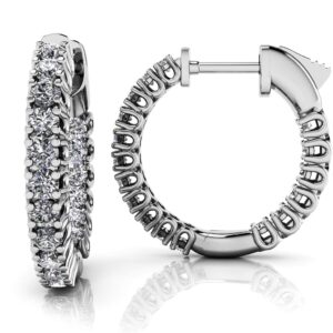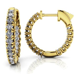 An elegant curved prong setting adds an interesting element to the design of these diamond hoop earrings. With a unique inside out hoop design, there is diamond sparkle on the front side of the earrings and along the interior. These extra small hoop earrings are available in 4 different sizes including .69, .84, 1.12, and 1.60 carats of total diamond weight. Measuring at .66., these are the perfect accessory you’ll want to wear all the time! Customize a pair in your favorite metal type; yellow gold, white gold or platinum.