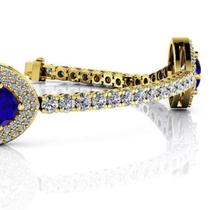 A touch of modern flair creates this posh diamond and gemstone tennis bracelet. The unique bracelet features vivid round diamonds connecting three triple halos of diamonds, surrounding a center gemstone of your choice. A gorgeous piece to add to your jewelry collection.
