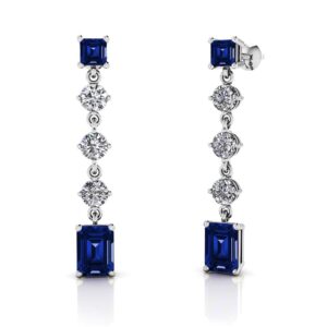 Modern and bold, these stunning earrings will catch your eye. A princess cut diamond at the post, cascades down with 3 round diamonds and ends with a sparkly emerald shaped diamond. Create yours today by selecting your metal type and diamond quality.