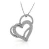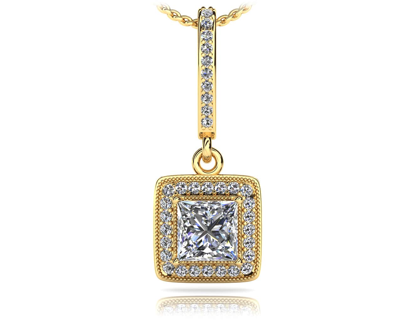This beautiful diamond pendant has a diamond lined hoop connected to a gorgeous drop pendant below. The square shaped drop portion features a princess cut diamond surrounded by smaller round diamonds and milgrain edging. Choose from four different sizes including .33, .55, .77, and 1.05 carats.