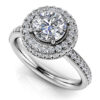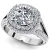 This stylish diamond engagement ring truly highlights the beautiful center diamond with its unique design. A prong setting holds each round diamond secure. Diamonds are lined along the split shank and top, where they continue to encircle the center stone. There are five sizes to choose from ranging from .94 to 1.98 carats. The diamond count will vary from 61-66 diamonds depending on your selection for total carat weight. Tailor this sparkly design in her favorite metal type for a ring she’ll definitely say .Yes. to!