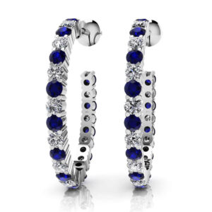 These oval shaped hoop earrings feature a long line of alternating gemstones and diamonds down the front. An elongated oval shape makes these earrings very stylish! Available in 4 different sizes, ranging from ¾ carat to 1.5 carats total carat weight, these look lovely on anyone! We can craft them in your choice of gold or platinum and favorite gemstone. A shared four prong setting keeps each beautiful stone secure. You will enjoy having these hoop earrings in your jewelry wardrobe! All gemstones are AA quality.