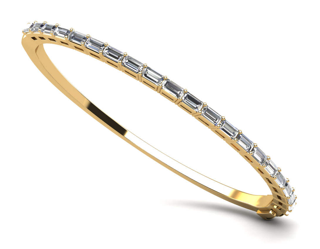 This elegant bangle bracelet features emerald cut diamonds carefully set in prong settings long the top. It is available in 3 different total carat weights to choose from and in various metal types. Customize your own today.