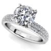 This dreamy design features three rows of diamonds along the ring shank and a breathtaking four prong center diamond. Choose from five sizes for the round center stone including .50, .75, 1.00, 1.25 and 1.50 carats. The 48 small diamonds contribute to the tremendous sparkle of this design. Beautiful in both gold and platinum, this ring is a terrific way to say your love is eternal!