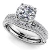 This gorgeous bridal set is stunning with its creative design. The engagement ring sparkles with two prong set round cut diamonds and a larger center diamond encircled by a halo of round diamond. The wedding band highlights the engagement ring with an ext