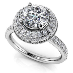 You’ll fall in love with the beauty of this vintage inspired diamond engagement ring! A beautiful round center diamond is set with a four prong design and surrounded by a double row of round diamonds. Millgrain edging adds a vintage style to the ring head and shank. You can choose from five sizes including .92, 1.20, 1.46, 1.75, and 2.00 total diamond carat weights. Plus, you can customize this dazzling diamond ring in white gold, yellow gold or platinum for an exceptional item that will remind her why she fell in love with you, time and time again!