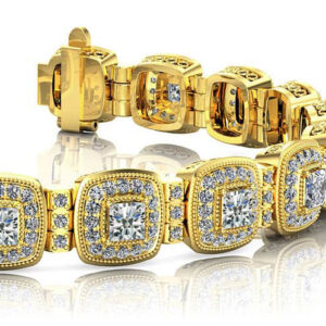 This red carpet bracelet is full of beautiful details and brilliant diamonds. Each link has princess cut diamond secured with four prongs, bordered by millgrain edging and another row of smaller diamonds. In between each diamond link is set of three diamond tube links. The diamond tube links adds flexibility and sparkle. Customize in white gold, yellow gold or platinum to create a splendid diamond bracelet.