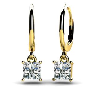 This beautiful pair of princess cut diamond drop earrings can be customized in your favorite metal type, diamond quality and size! A leverback connects to the drop portion with a small loop. A four prong setting holds each princess cut diamond secure. Available in 8 different sizes so you can find the perfect pair. The sizes range from .25 total carat weight to 3 carats!