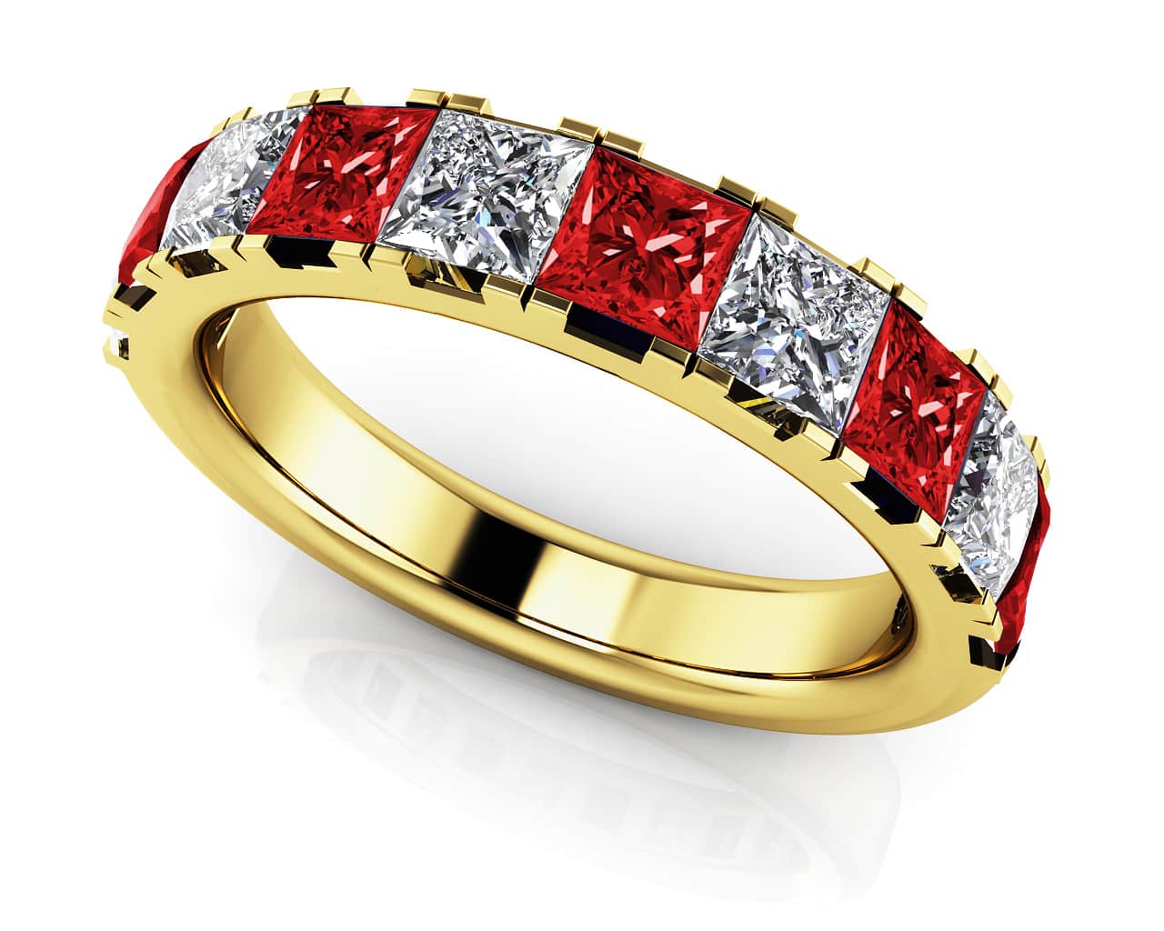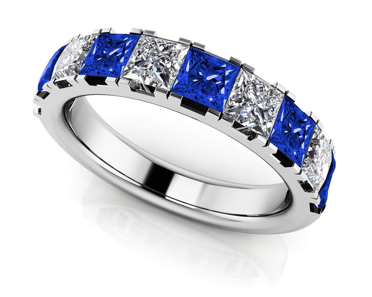 We took our classic four prong princess cut ring and added gorgeous gemstones. This ring design has alternating gemstones with diamonds along the top of the ring. There are six sizes to choose from ranging from .91 carat to 2.08 carats and a choice of gold or platinum. Plus, you can specify which gemstone you like to create a custom ring that truly is an expression of your love. This ring is a wonderful match for a diamond engagement ring or can be worn as an anniversary band. The choice is yours!
