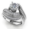 Say .I do. to this fabulous bridal set! The princess cut center stone is beautifully surrounded by a double halo of round diamonds. The princess cut and round side stones add even more sparkle to this already stunning style. The matching wedding band perfectly enhances the engagement ring to complete this gorgeous design. Create the ring of her dreams with your choice of metal type, total carat weight, and diamond quality.