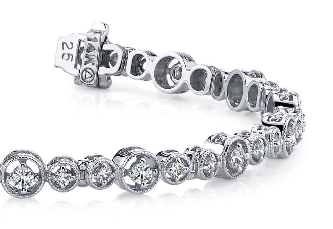 This piece is a very unique design and will be the pride of anyone who wears it! It has a very ‘vintage’ look and brings back memories of times gone by. Featuring 14 larger diamonds, and 28 smaller diamonds . this bracelet carries a total weight of 1.76 carats. Set in lovely two tone gold or platinum . if you’re looking for versatility . this bracelet is the perfect choice . it will go from daytime to evening . and look great with any outfit.