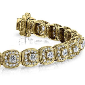 This red carpet diamond bracelet is full of beautiful details and luminous diamonds. Each link has a princess cut diamond secured with four prongs, bordered by millgrain edging and another row of smaller diamonds. A substantial and quality design, this bracelet is the perfect accessory for a red carpet affair or special event! Choose from gold or platinum metal types to design the perfect one!