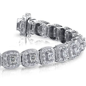 This red carpet diamond bracelet is full of beautiful details and luminous diamonds. Each link has a princess cut diamond secured with four prongs, bordered by millgrain edging and another row of smaller diamonds. A substantial and quality design, this bracelet is the perfect accessory for a red carpet affair or special event! Choose from gold or platinum metal types to design the perfect one!