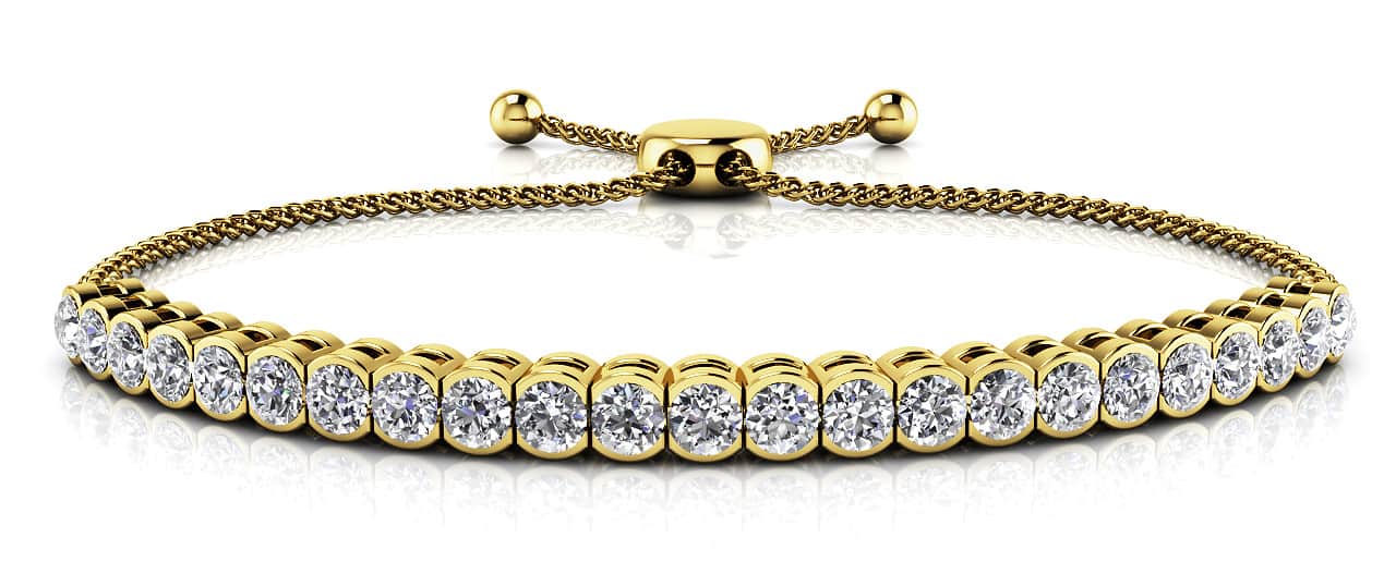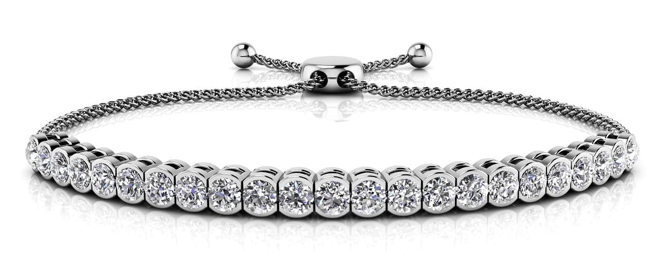 A modern twist to finish your look! Each diamond is expertly set in a half-bezel setting with a secure adjustable slider bracelet for a beautiful take on a classic design. Choose yours today in either a gold or platinum setting.