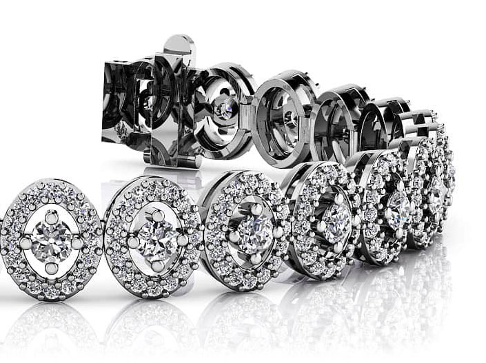Create a bracelet you will pass down from generation to generation. This vintage inspired diamond bracelet boasts hundreds of round prong set diamonds in an oval shape surrounding each center diamond. This bracelet is the perfect choice as the heirloom pi