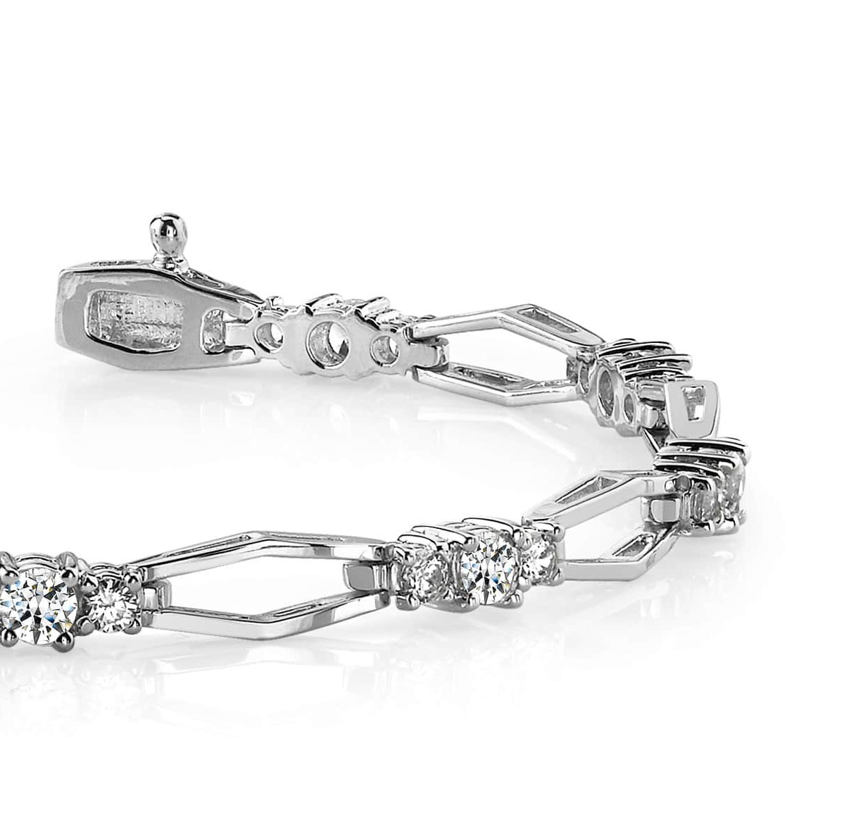 This designer bracelet features hexagon shaped links that sit between trios of dazzling diamonds. The diamonds are set with four prongs and the design has two smaller diamonds on the side of one larger diamond. This is a wonderful bracelet for everyday wearing or when you are looking to dress up an outfit! This one of a kind bracelet lets you play designer by selecting the diamond quality and metal type! Select from yellow gold, white gold or platinum and from two sizes, either a 1.35 ct. or a 2.25 ct. Order one as a gift or for yourself today!