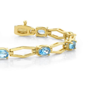 Talk about design…this bracelet has it all. Each incredible, prong-set, oval colored stone sits between a gold or platinum Hexagon-shaped link. This piece has a very unusual look and is truly a ‘stand-out’! And..it’ll stand-out in any of the 3 available sizes with either 9 or 10 incredible colored stones..so you have lots of choice with this one. It features a very sturdy clasp and sits perfectly on any wrist! Oval and hexagon . a geometric masterpiece!