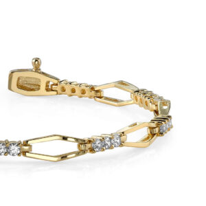 This designer bracelet features hexagon shaped links that sit between trios of dazzling diamonds that are set with shared prongs. This is a wonderful bracelet for everyday wearing or when you are looking for a modest amount of glamour! Still this one of a kind bracelet lets you play designer by selecting the diamond quality and metal type! Select from yellow gold, white gold or platinum and from two sizes, either a 1.25 ct. or a 2.16 ct. Order one as a gift or for yourself today!