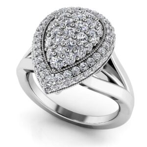 This exquisite halo ring delicately frames the unique pear shaped center full of diamonds. The intricate milgrain detailing and split band add a graceful touch to a modern piece or unhinge the center portion and split a delicate chain through the bale and wear as a gorgeous pendant necklace. Simply select the metal type, total carat weight , and diamond quality.