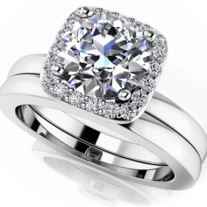 Celebrate your journey together with this beautiful bridal set. A radiant cushion cut center diamond is perfectly paired with the halo of brilliant round diamonds that surrounds it. The sleek and elegant bands are available in your choice of gold or platinum, in several carat weights to choose from.