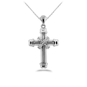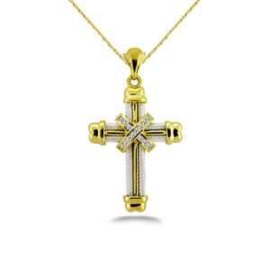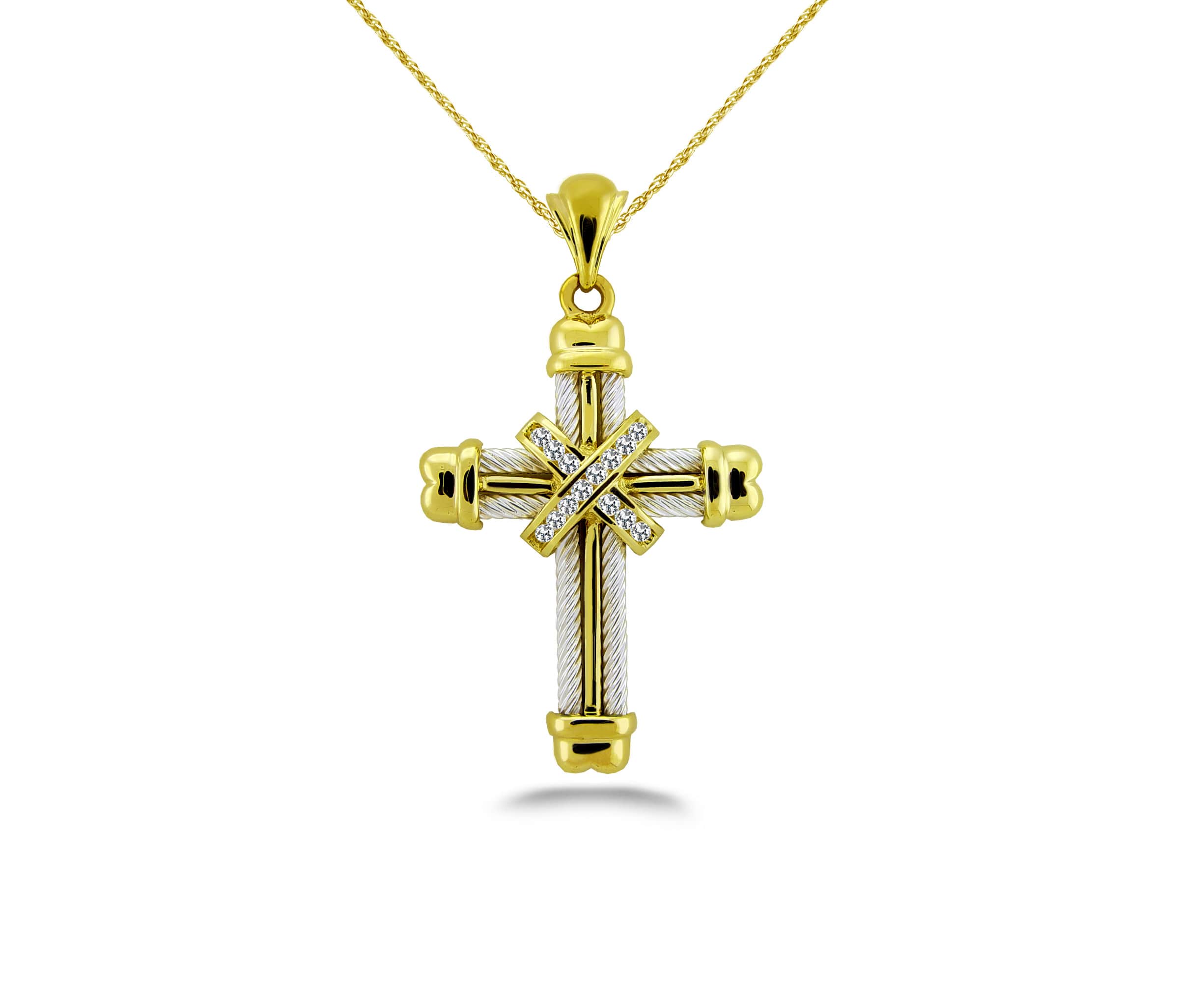 A wonderful, two-tone cross pendant, this is not just a symbol of your faith & devotion, but it’s truly a wearable work of art. The cross is crafted in your choice of gold or platinum, and is available in two different sizes. It also features a diamond-lined criss-cross around the main pendant. Choose from ether the 1.25mm size, featuring .25 carats total diamond weight or 1.75mm, which beautifully shows off .35 carats total diamond weight. A lovely and stunning symbol for you to enjoy!