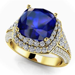 A show-stopping array of diamonds will take her breath away with this stunning ring. The brilliant cushion cut gemstone of your choice is perfectly centered amongst a double halo of icy round diamonds. The diamonds continue in a tapering pattern along the sides of the band to form a lasting legacy of sparkling radiance. Available in several carat weights in your choice of gold or platinum setting. All gemstones are AA quality.
